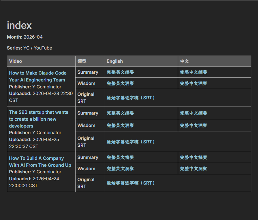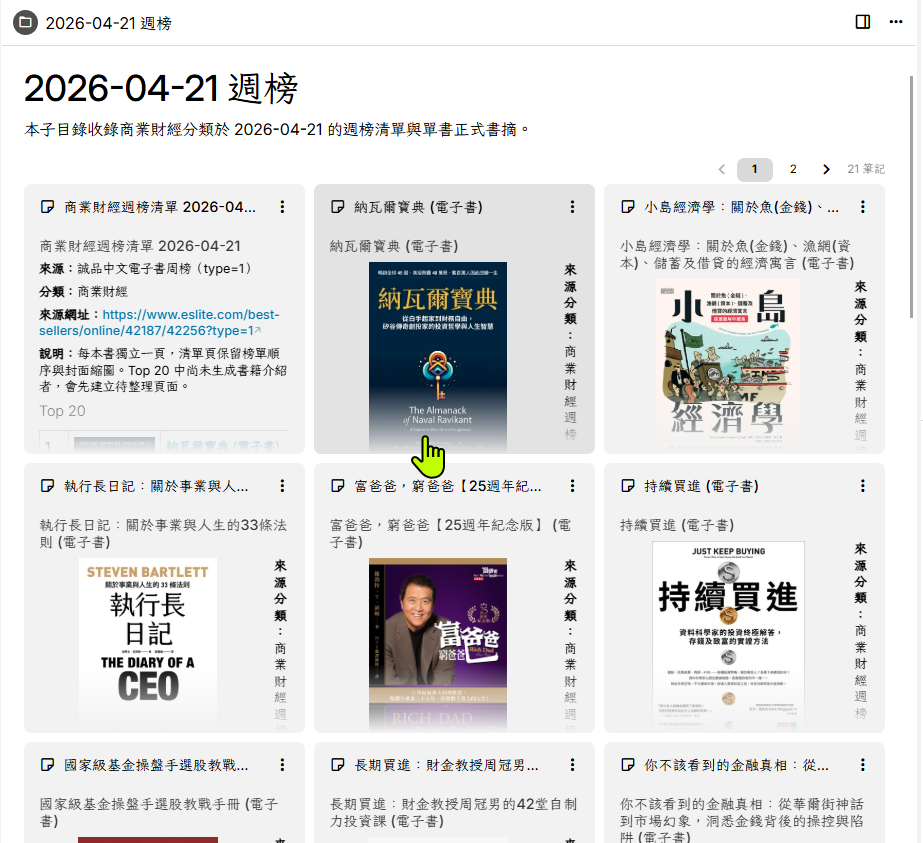 整合影片、書籍與各類輸入來源,完成摘要、重點整理與分類,建立一條可重複使用的知識流程。